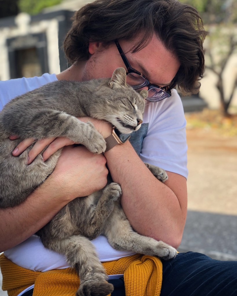 Another cat, who was clearly the top cat in the cemetery, decided to favor us with his attentions and we were almost unworthy of him. He was old, had a snaggletooth, shed like his hair like it had never been attached to his skin, liked to use his claws affectionately, and was an actual earthbound angel. Jessica and I collapsed to the ground to play with him and we couldn’t bare to tear ourselves away, so we made sure to immortalize the moment with a photo shoot. Who knew that my iPhone X’s portrait mode would work so well on charming images of us cuddling cats? Take a look and marvel.